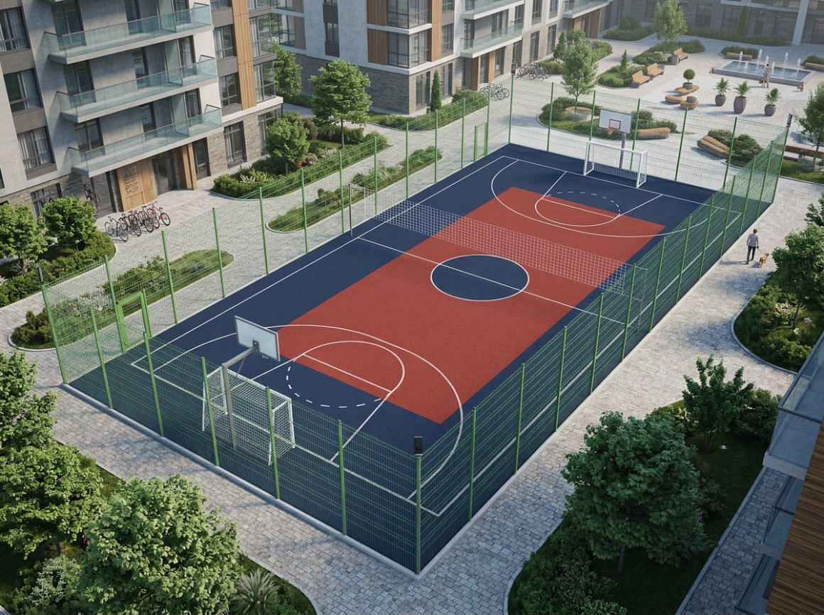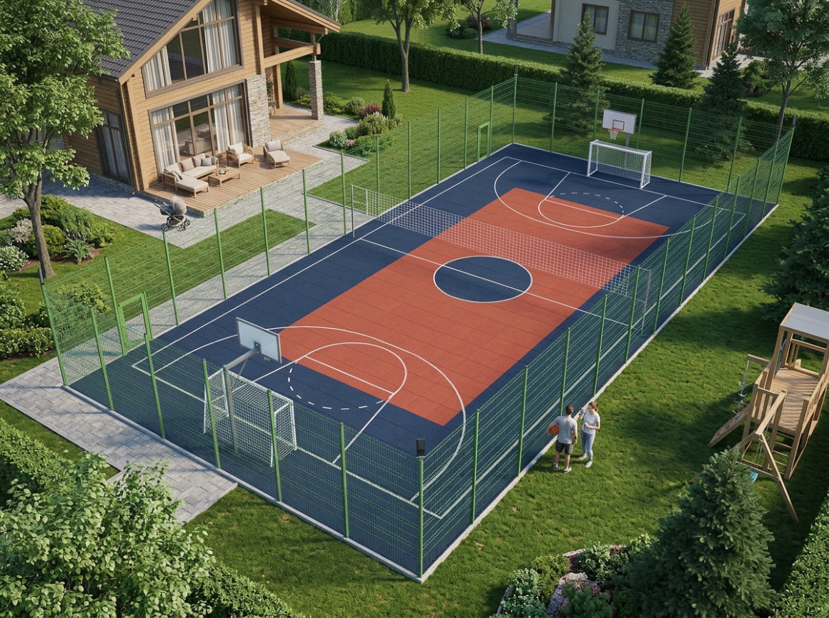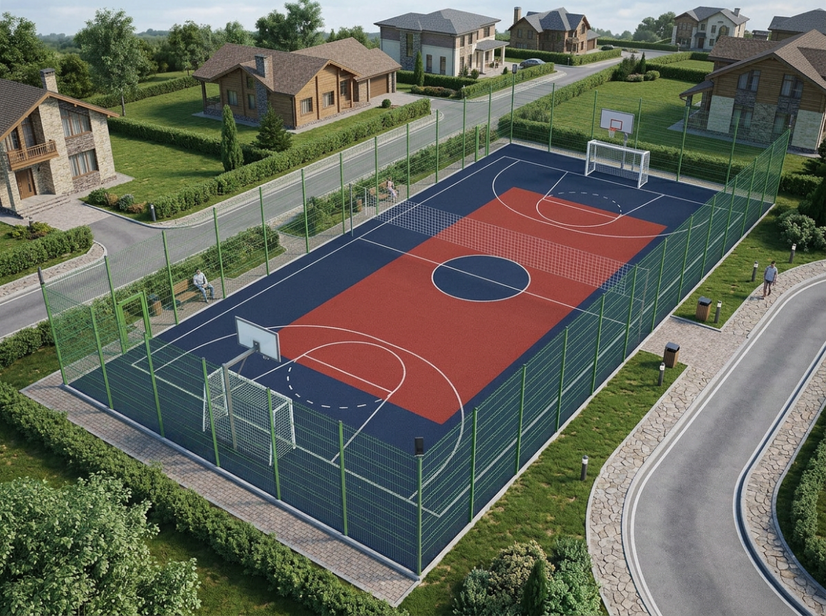 Формат 15×30 метров — один из самых популярных размеров универсальных спортивных площадок. Увеличенная длина позволяет комфортно проводить игры в мини-футбол, баскетбол и волейбол. Площадка подходит для образовательных учреждений, дворовых территорий и спортивных зон в жилых кварталах.